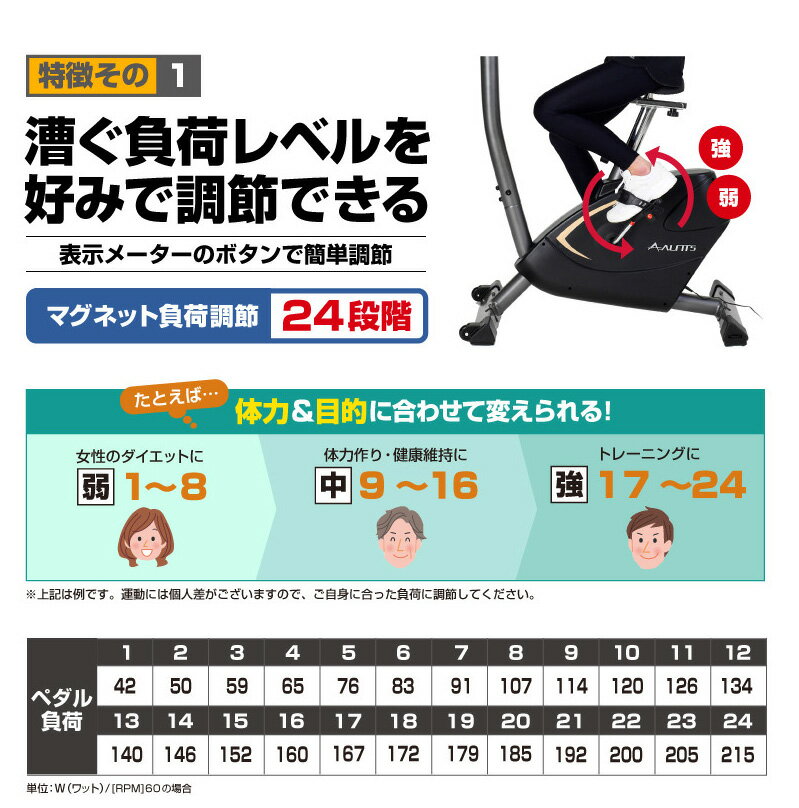 12種類のプログラムを搭載心拍数測定可能ハンドルの角度調節可能ペダルバンド付き移動用のキャスター付きタブレットトレー搭載スマホやタブレットを充電できるUSB電源を搭載サイズ:W560 × D1,040 × H1,425 mmサドル高:L 805 〜 H 1,025 mm (30mmピッチ9段階)負荷方式:マグネット負荷方式24段階調節製品質量(重量):約26.0kg連続使用時間:30分耐荷重:90kg電源:AC100V(50/60Hz)定格消費電力:4.5W材質:スチール、ABS(アクリロニトリルブタジエンスチレン共重合合成樹脂)、PP(ポリプロピレン)、PVC(ポリ塩化ビニル)、PU(ポリウレタン)生産国:中国製品保証:1年カラー:ブラック(黒)※製品改良の為、デザイン・仕様を一部変更する場合がありますがご了承ください。